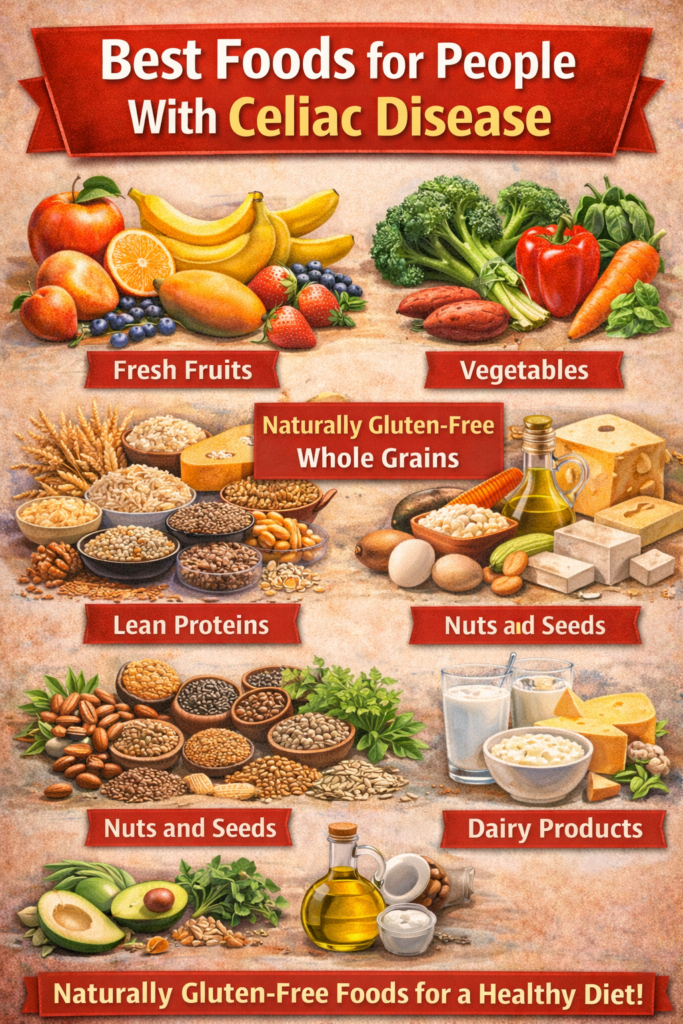 The only effective treatment for celiac disease is a strict gluten-free diet. Fortunately, many delicious and nutritious foods are naturally gluten-free and safe to eat. Choosing the right foods not only prevents symptoms but also helps the body heal and maintain good overall health.